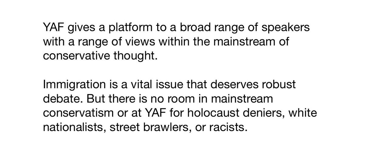 This is what YAF said as it broke ties with Malkin: “There is no room in mainstream conservatism or at YAF for holocaust deniers, white nationalists, street brawlers, or racists.”