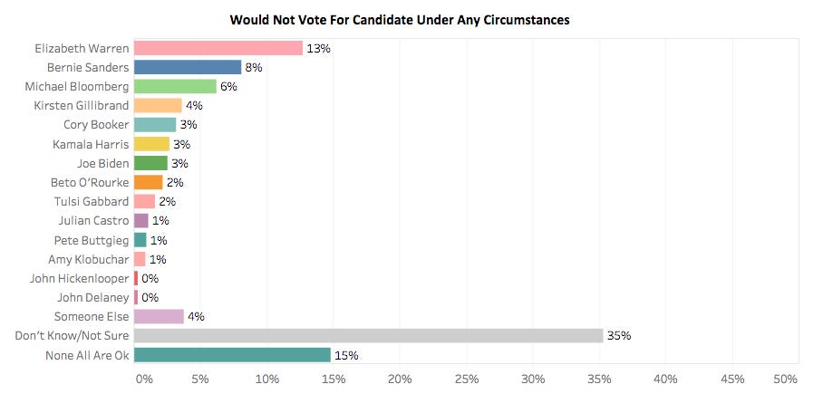 Once again, these are New Englanders who see and hear from Warren regularly. And by a 2 to 1 margin, they more find her unacceptable than former New York mayor Michael Bloomberg who, in addition to his attacks on popular liberal proposals like Medicare for All, is an unapologetic Yankees fan.