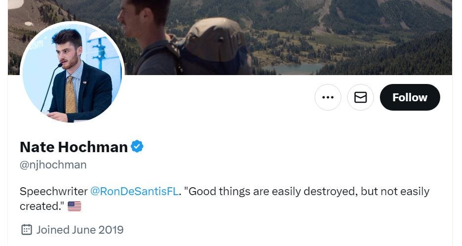 Update (March 26, 2023, 4:45 p.m. EDT): Within 24 hours of this article’s publication, Nate Hochman had changed his Twitter bio, downgrading his self-description from “Speechwriter @RonDeSantisFl” to the more ambiguous “Team @RonDeSantisFl.”