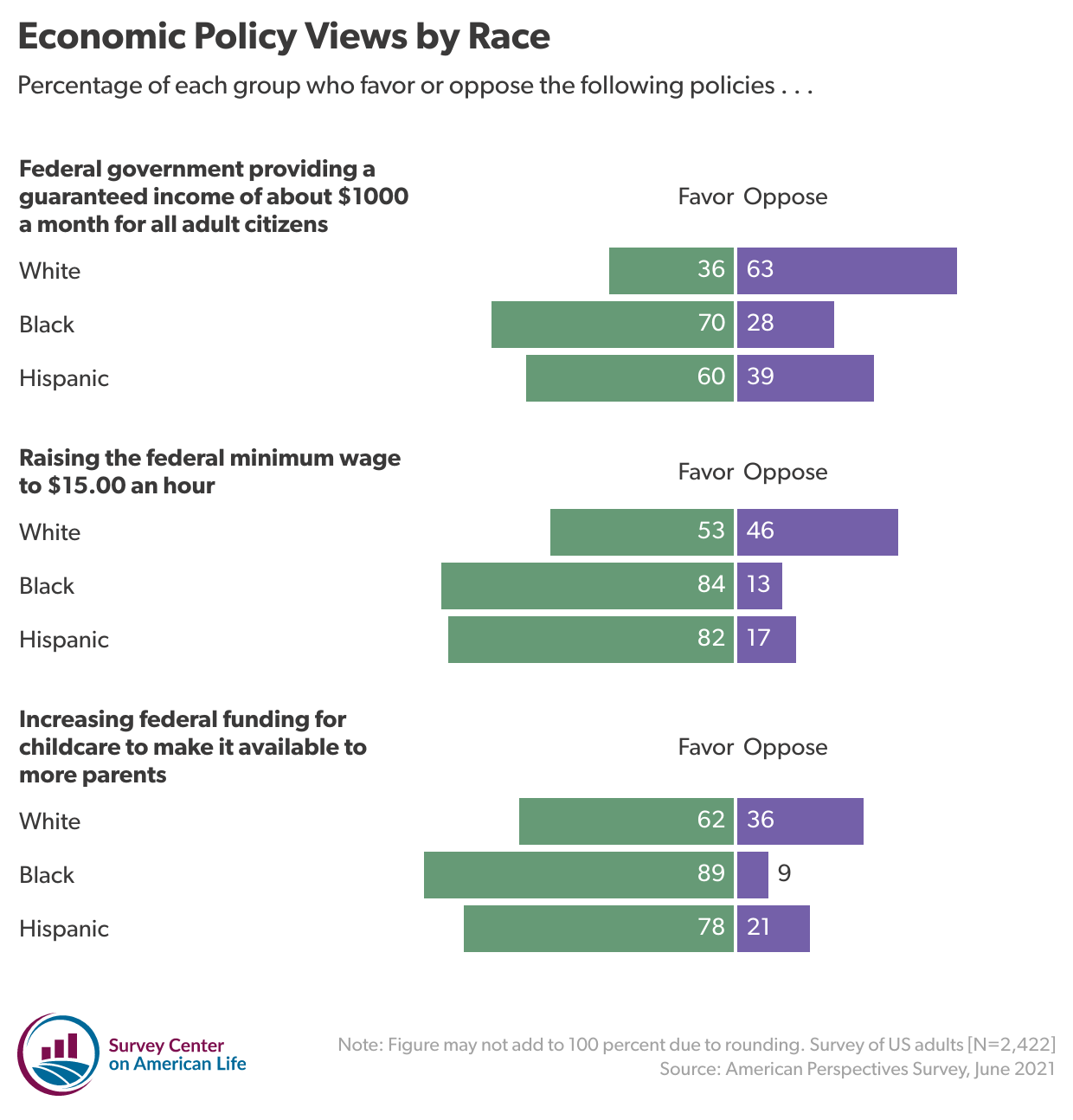 In other words, Hispanics are conflicted on the degree to which government should intervene in the economy, even under crisis conditions, and tend to take a more skeptical view of benefits that might discourage work while supporting some measures, like higher minimum wages and childcare subsidies, that ease some of the struggles faced by working families.