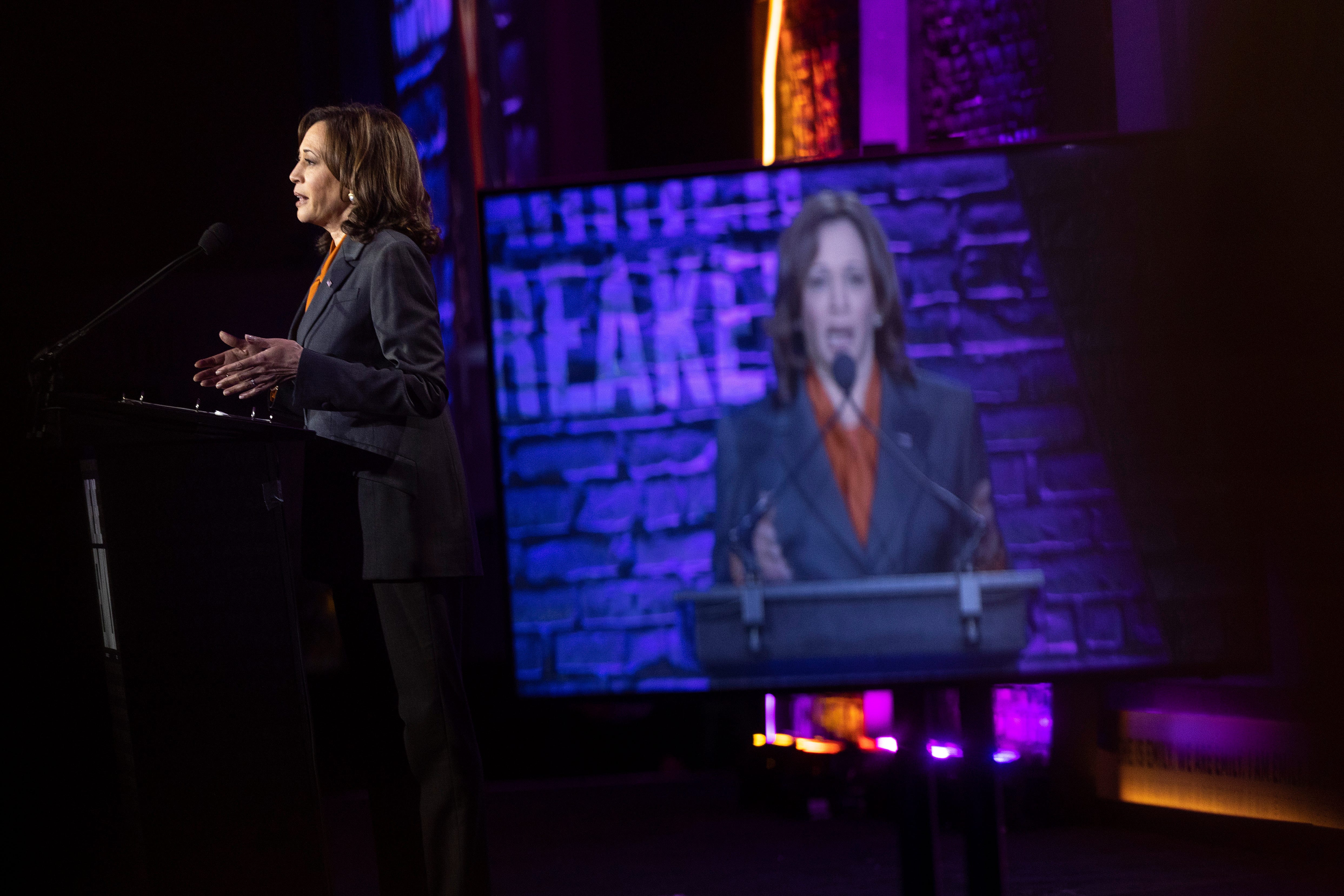 KAMALA HARRIS WAS AMONG FRIENDS at the annual fundraiser gala for EMILY’s List this week. Her smile dazzled as she talked of the “many joys” of being vice president, and her tone was by turns disbelieving and resolute as she described “book bans in this year of our Lord 2023” and “extremists” planning to go national with attacks on legal abortion, voting rights, gay rights, black history lessons, and more. Addressing a hall packed with cheering, applauding women, Harris said she and Joe Biden have been fighting to uphold and protect “hard-won rights and freedoms” for two years, “and now we need to finish the job.”