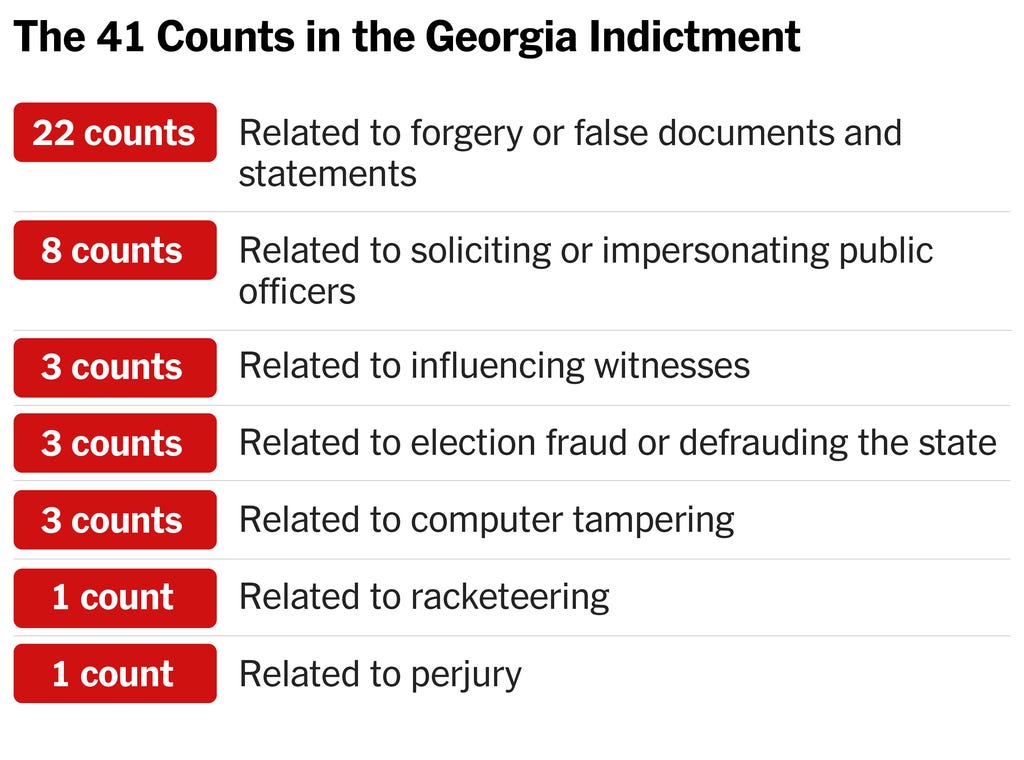 True. But the GOP frontrunner now faces trial on felony charges in New York, Florida, D.C., and Atlanta.Via CNN: “Former President Donald Trump has been charged with 91 crimes in four criminal cases, in four different jurisdictions.”