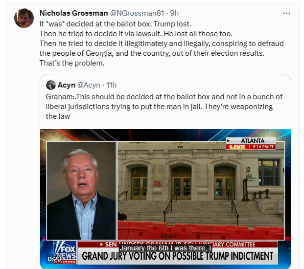 Exit take from Jonathan Chait: “Maybe, just maybe, the reason Trump keeps getting indicted for crimes is not that the criminal justice system is in the grips of a vast liberal conspiracy but that he is, in fact, a criminal?”