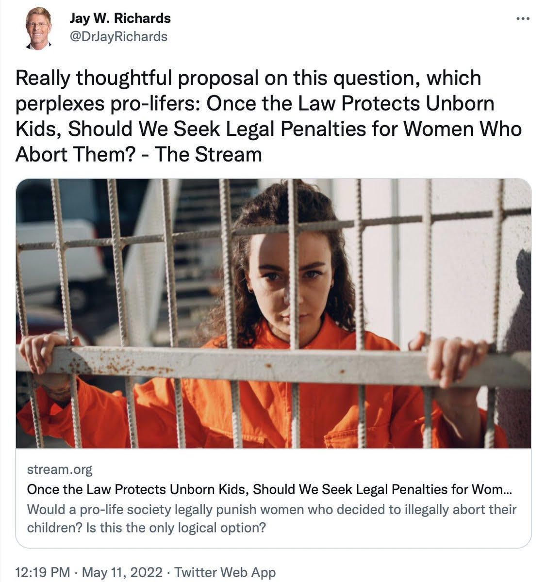 Nor should you be surprised if the focus of punitive legislation turns toward women. Consider this remarkable proposal touted by the Heritage Foundation’s Jay Richards. (Richards is the William E. Simon Senior Research Fellow in Heritage’s DeVos Center for Religion and Civil Society.)