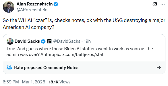 GRUBBING FOR ANTHROPIC’S BUSINESS: In its standoff with the AI company Anthropic, the Defense Department has been as bad as its word. On Friday, after it became clear that Anthropic would not drop its redlines forbidding use of its AI for mass domestic surveillance or autonomous weapons systems, Defense Secretary Pete Hegseth went nuclear—not just canceling the Pentagon’s $200 million Anthropic contract, but also banning all defense contractors from working with Anthropic in any way. It was a ridiculous, utterly disproportionate retaliation: The Pentagon now officially trusts Anthropic, the American AI lab that until now has been the most enthusiastic about supporting U.S. national-security aims, less than it does Chinese AI firms like DeepSeek.
