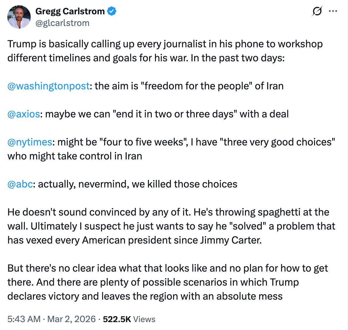 Meanwhile, Trump is unfortunately spreading confusion about rather than clarifying our war aims. Over the last two days, President Trump made such contradictory remarks that one can have no confidence that he really knows what he’s doing. The Economist’s Gregg Carlstrom summarized the situation well early this morning: