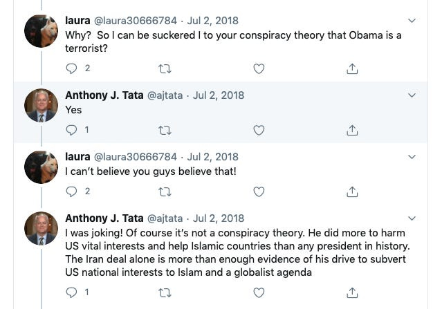 Elsewhere, Tata suggested that Obama’s nuclear deal with Iran was “sorta from [Obama’s] Islamic roots to help Iranians and the greater Islamic state crush Israel. . . . If it walks like a duck and talks like a duck, it’s probably a duck.”