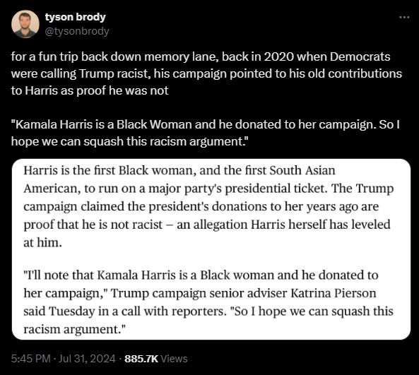 So why did Trump go out of his way to introduce this lie to the campaign? Why did Trump then double down on it on social media, posting: “Crazy Kamala is saying she’s Indian, not Black. This is a big deal. Stone cold phony. She uses everybody, including her racial identity!”