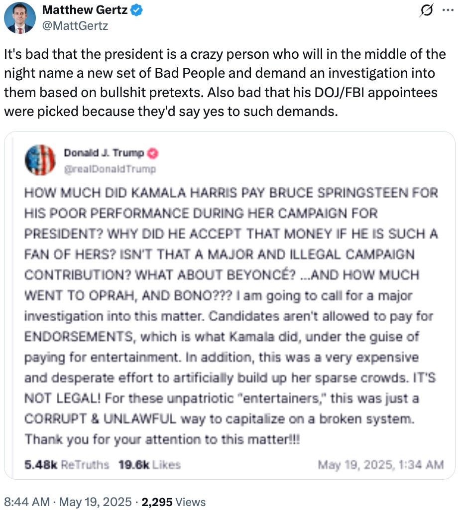 Musk had been deeply unpopular in public polls all year, and the public plainly assessed that he was making a dog’s breakfast of DOGE. So it’s not that surprising that Trump would try to put him out to pasture. What is surprising is how little difficulty he’s apparently had in doing so. We’d have expected that Musk—with his monumental ego and public megaphone—might prove more difficult for Trump to shake off than the median Trumpworld hanger-on. Appears not.