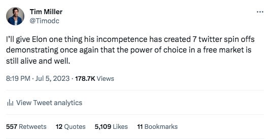 One final thing I’ll say for Elon. If he has done any service with his Twitter lunacy, at least he has demonstrated that creative destruction and the free market are still alive and well in America!