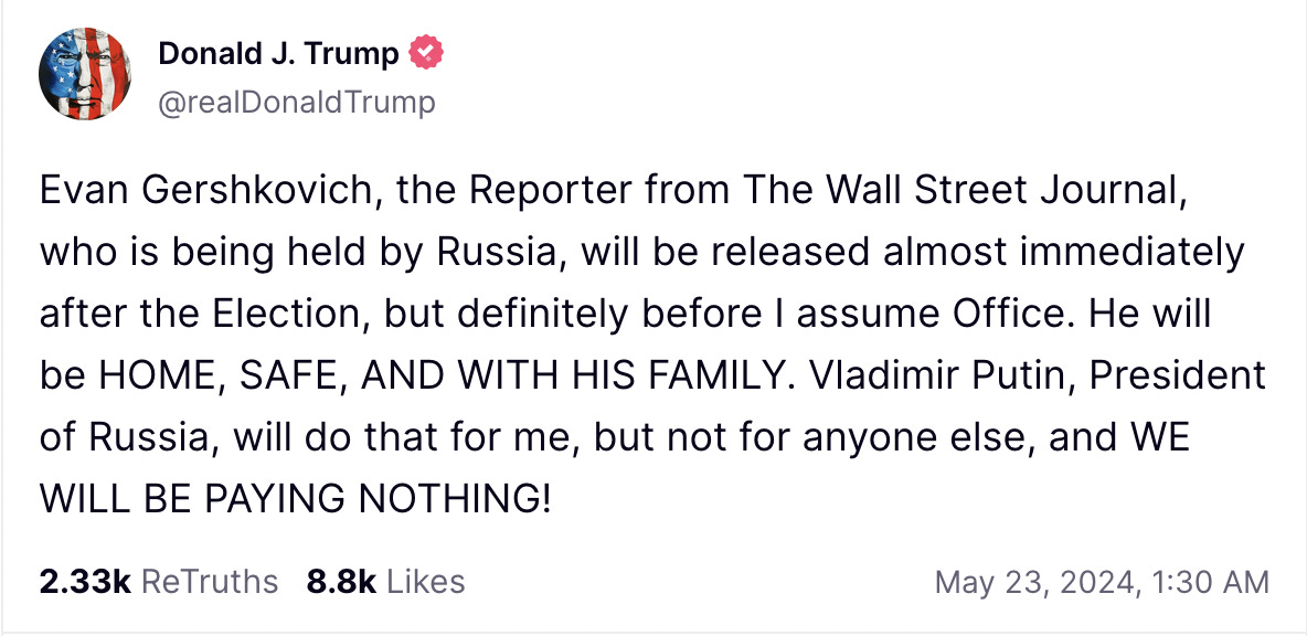 On the site today, A.B. wonders—are we really going to just memory-hole Trump proclaiming that Vladimir Putin would release imprisoned WSJ reporter Evan Gershkovich after the November election “for me, but not for anyone else”?
