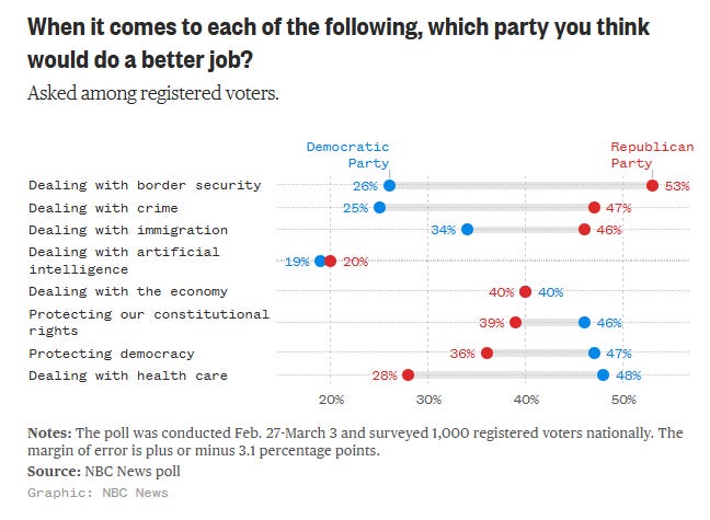 I look at this poll and I truly wonder who these people are, if they pay attention to what is going on around them, do they go to the grocery store. The economy is tanking and absolutely everything trump has done since he took office has caused this. He is well on the way to crashing our economy like he did in his first term. Biden fixed that left us the best economy in the world. Remember W crashed the economy and Obama fixed it, the stupidity of Reganomics caught up with Bush I, Clinton fixed it and left us a balanced budget. Why in the name of all that is sane do people trust republicans more with the economy.