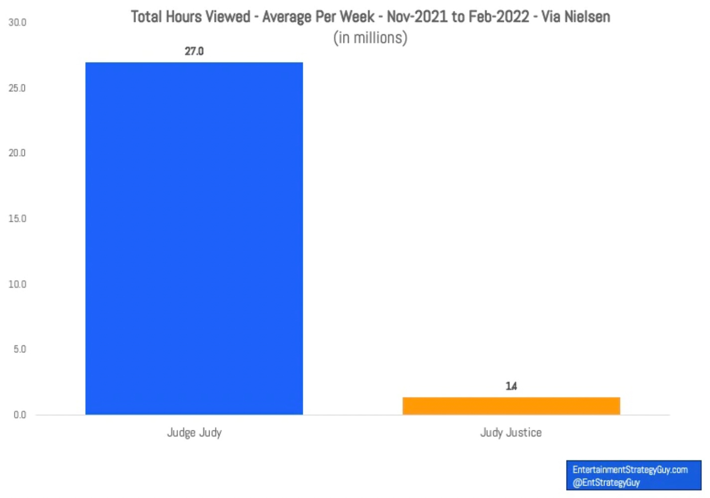 How are these stealth-reruns doing on CBS? Pretty well! The ESG drilled down on the numbers and found an average of 7.3 million viewers per minute for Judge Judy. But over on IMDb TV, Amazon is bragging that “Justice Judy” has streamed 25 million hours. That sounds really good!