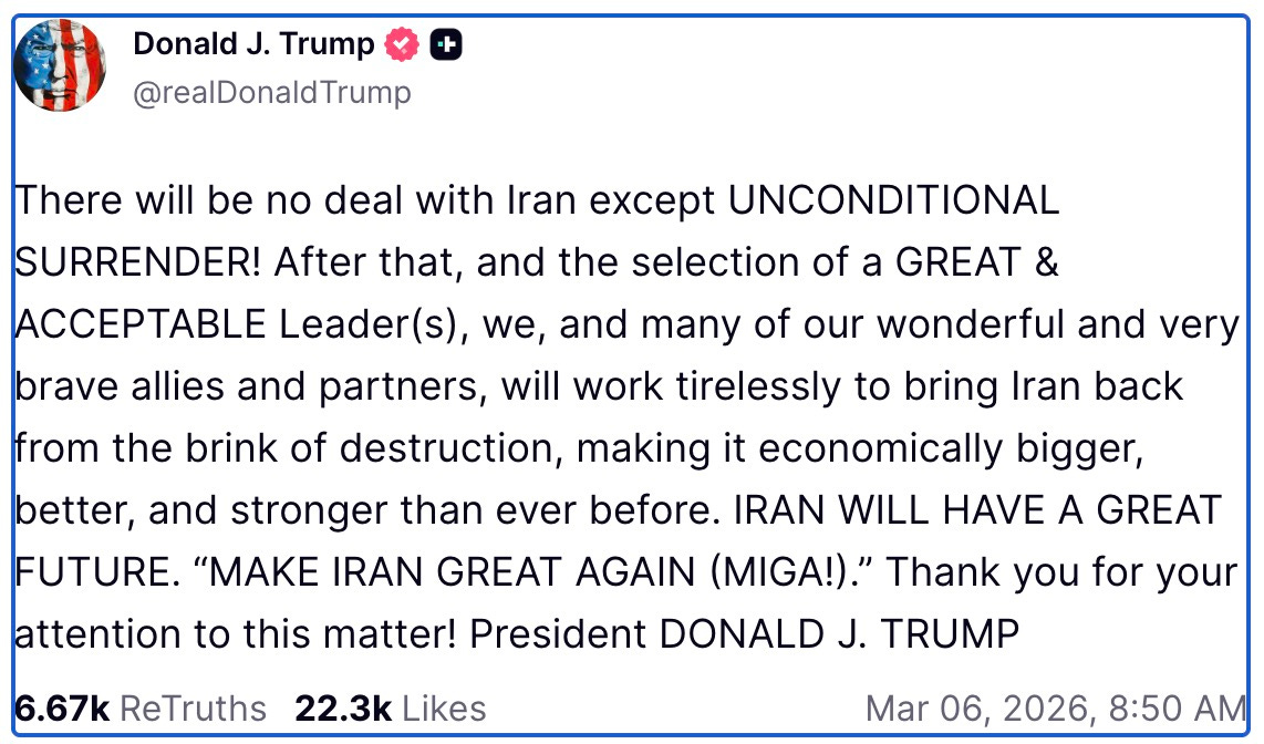 March 6, 8:50 a.m. EST: “There will be no deal with Iran except UNCONDITIONAL SURRENDER!”1