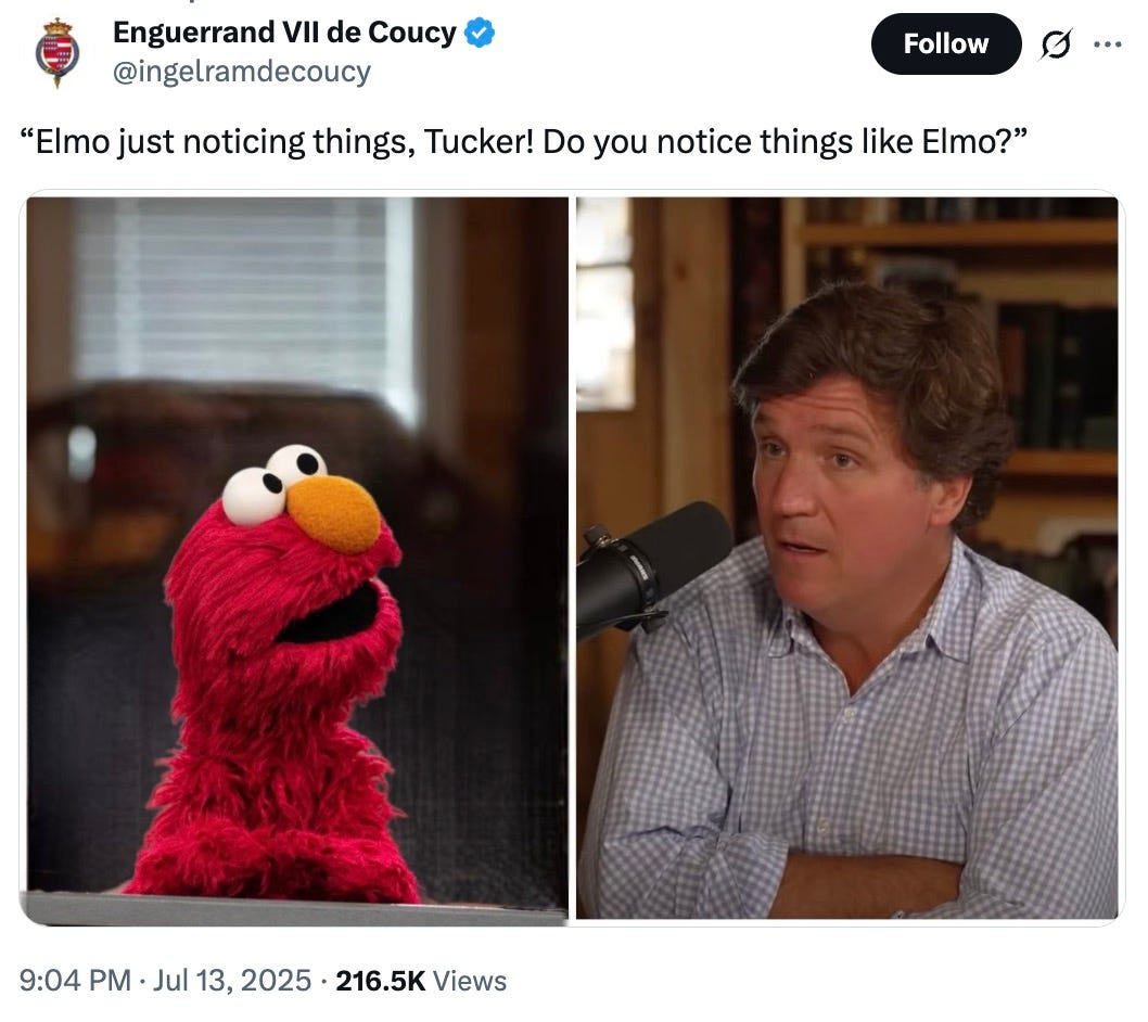 Twitter may be a shell of its former self these days, but we’ve got to admit it’s still a place for experiences you’d struggle to replicate anywhere else. Like this weekend, when the account of Sesame Street’s Elmo was hacked and the fuzzy red muppet started posting antisemitic garbage and accusing Donald Trump of being in the Epstein files. Happy Monday.