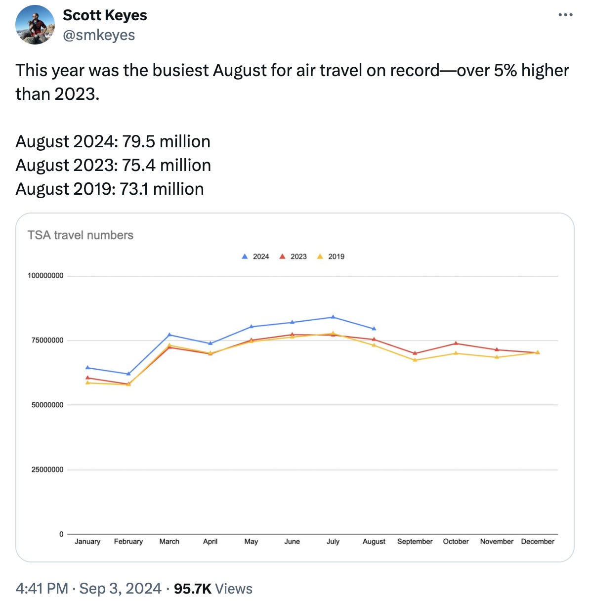 By the same token, how does anyone look at the real world and not understand how great things are? We just broke all records for air travel in August. This is not a thing you do unless the economy is in good shape.