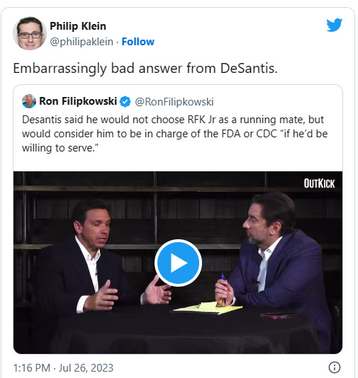 Even his longtime conservative defenders were gobsmacked by the stupidity of Meatball’s pander. Via Mediaite: “Conservatives: DeSantis's RFK Comments 'Embarrassingly Bad'.”