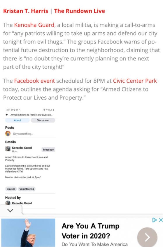 A 17-year boy armed with a rifle killed two people and wounded a third in Kenosha. Here's the call to members of right wing militias to descend upon the city in the wake of the police shooting of Jacob Blake.