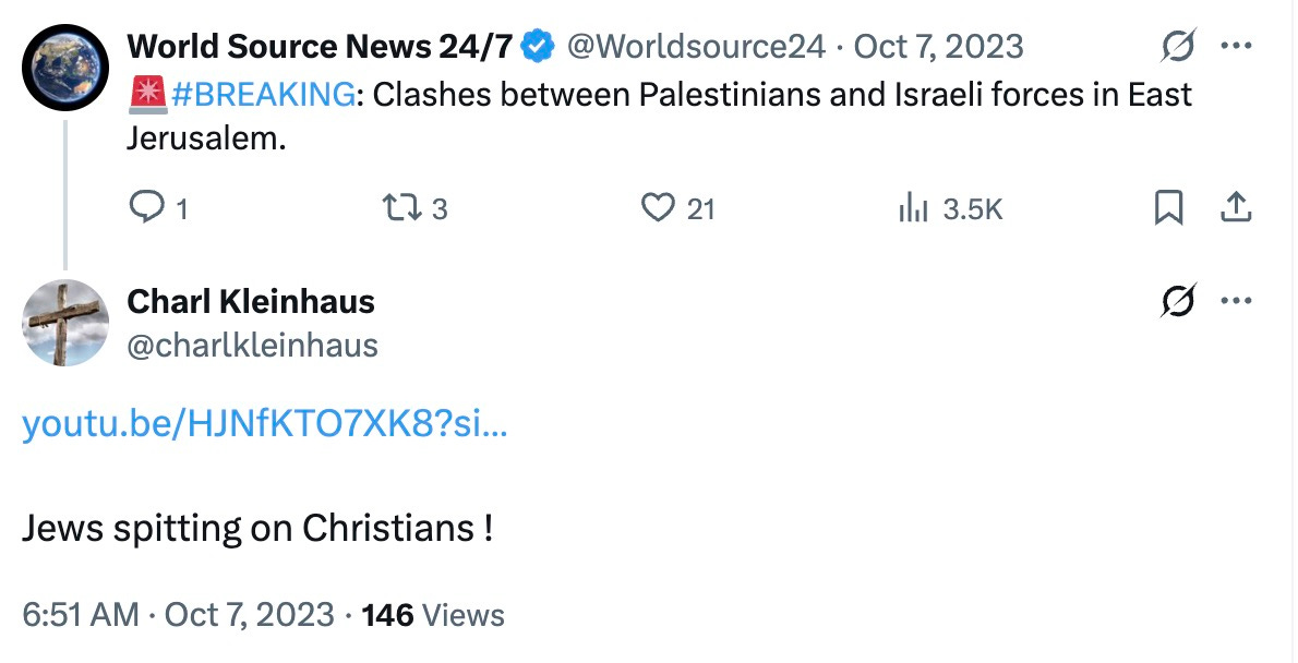Five days after the October 7th attack, Kleinhaus posted a link to another video, hosted by a Facebook account called “Israel Is a Terrorist State,” that showed clashes between Christians and Israeli police. Kleinhaus wrote: “Jews attacking Christians!”