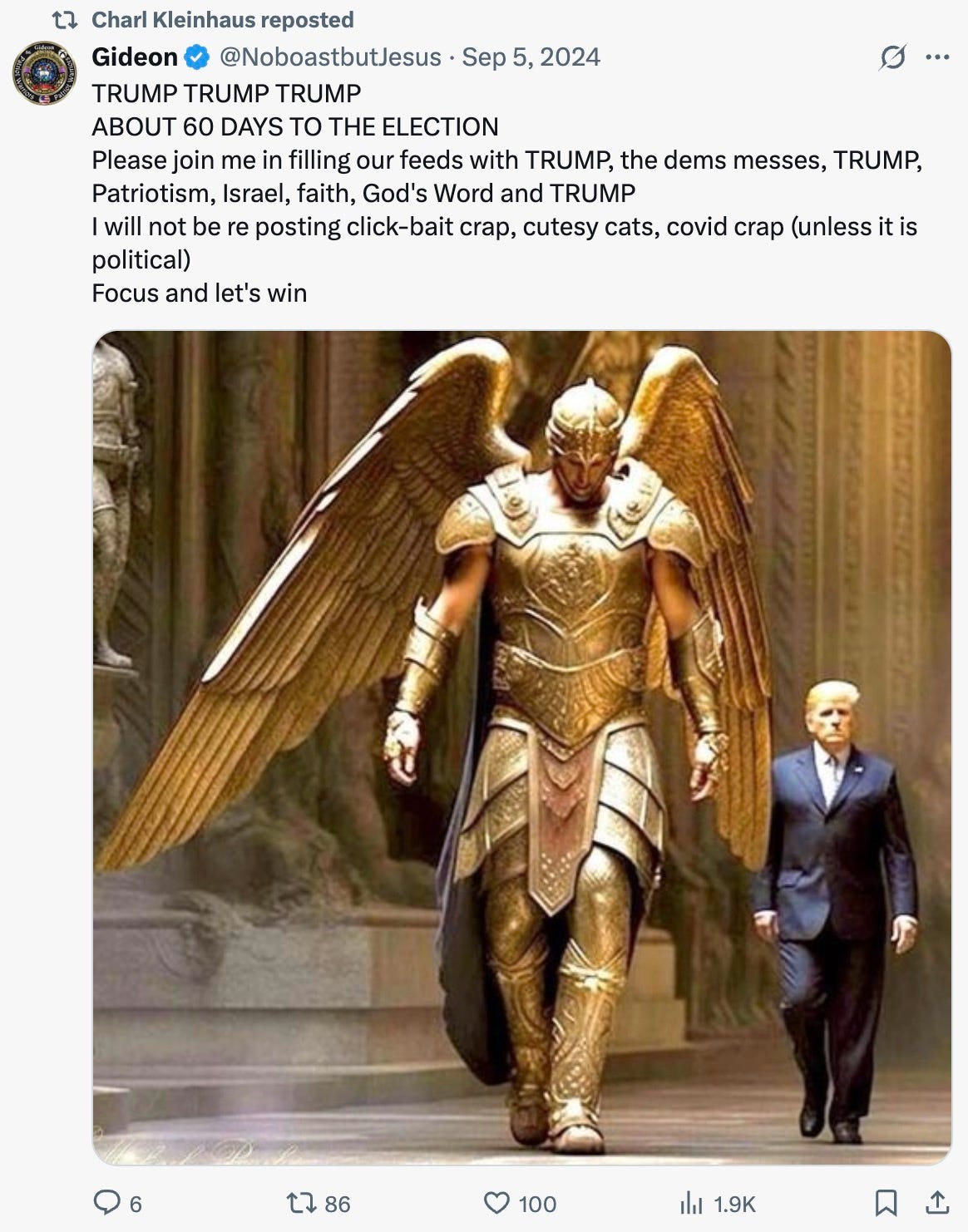 Maybe the difference is that Kleinhaus is ostentatiously Christian—his feed is full of retweeted Bible verses, Christian exhortations, and memes of Trump walking with angels.