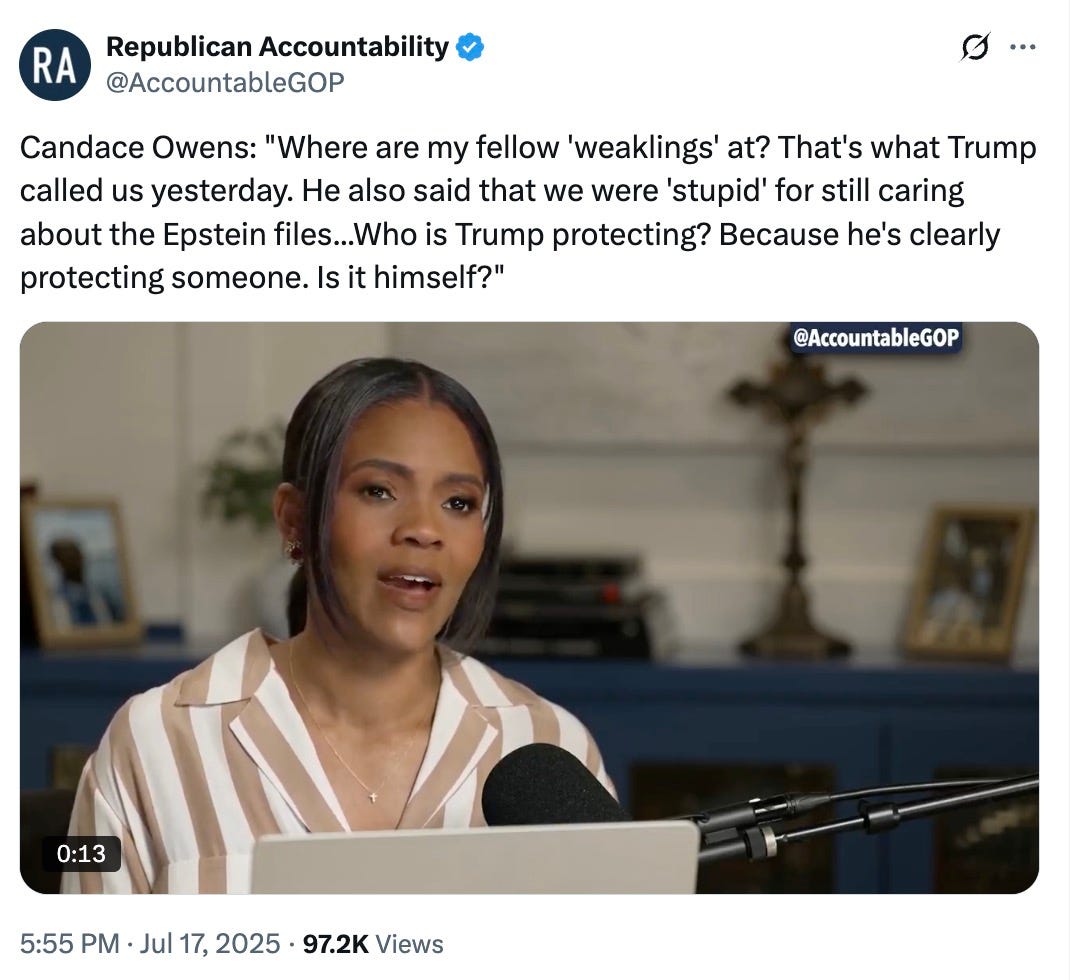 In a sane world, Trump’s supporters who have been dismayed by his handling of the Epstein matter might find his unconvincing defenses and farcical counterattacks (not to mention yet another point of proof that he and Epstein were kinda close) disconcerting. But I wouldn’t be shocked if the opposite turns out to be true—that they’re relieved in a way.