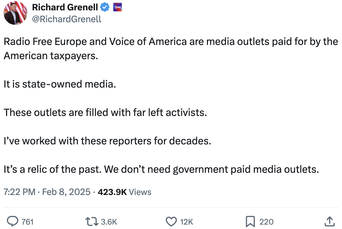 But more worrying still, the attacks on Voice of America and Radio Free Europe/Radio Liberty reflect Trumpworld’s strong antipathy to the international advancement of liberal values—“liberal” in the classical sense that encompasses John F. Kennedy and Ronald Reagan, both strong champions of VOA and RFE/RL: commitment to limited government, individual rights, and an open society based on political, religious, and intellectual pluralism. Trump and Musk’s disdain for liberalism is hardly surprising, but the possibility that it would take the form of dismantling these essential tools is incredibly worrisome.
