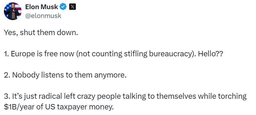 TO THE ASSAULT ON USAID and the crosshairs on RFE/RL and VOA, we can add yet another target in MAGA’s sights: the National Endowment for Democracy, which Musk has called a “scam” and which the Free Press’s Eli Lake reports is already being crippled by a DOGE-ordered funding block.