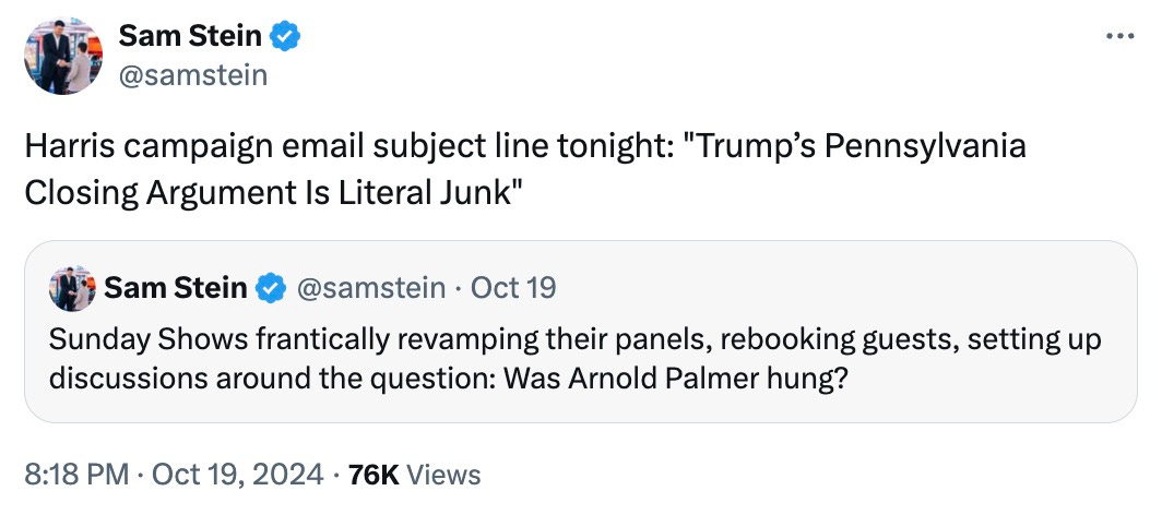 A LONG TALL TALE: You’d have a hard time finding a single better illustration of the shambolic closing act to Trump’s 2024 campaign than his Saturday rally in Latrobe, Pennsylvania. That rally kicked off with an extended riff on the size of the late golfer Arnold Palmer’s genitals: “This is a guy that was all man . . . when he took showers with the other pros, they came out of there, they said, ‘Oh my God, that’s unbelievable.’” A little later, Trump referred to Kamala Harris as “a shit vice president.”