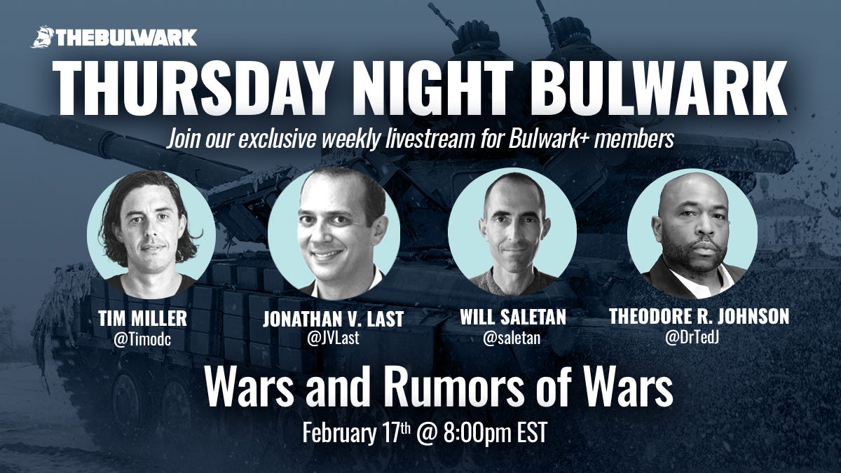 Ted Johnson makes his Thursday Night Bulwark debut appearance this week. He’ll join Tim, JVL and Will to discuss the news of the day.