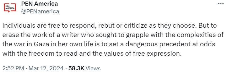 The same illiberalism has manifested itself in the torrents of abuse hurled at PEN America for daring to suggest that “published work should not be yanked from circulation because it sparks public outcry or sharp disagreement.” The organization was accused of “supporting Mein Kampf” and “apologizing for genocide apologists.” It was also repeatedly accused of failing to speak up for pro-Palestinian writers who had books and cultural events canceled—even though it did speak up against such cancellations two weeks after the October 7th attacks.