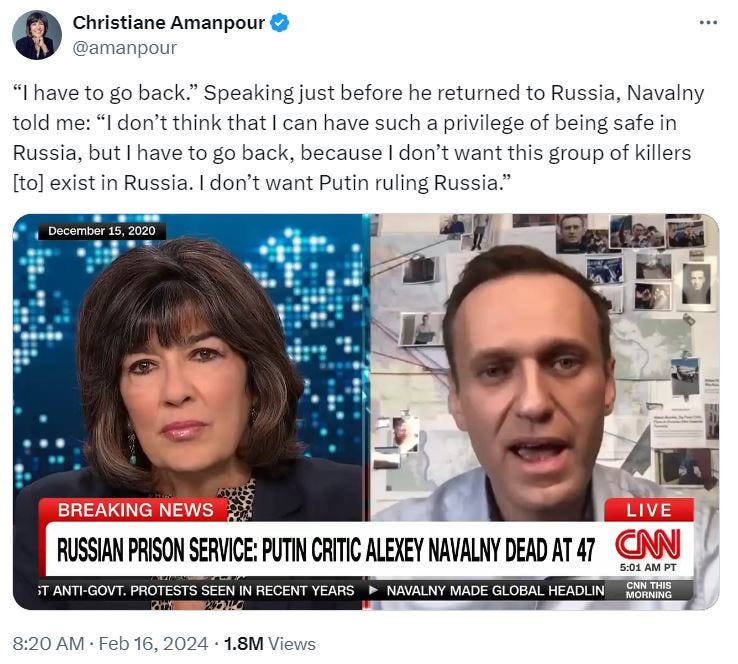 Navalny’s blood is on Putin’s hands. It matters not whether he had Navalny murdered Friday or simply drained the life from him through month after month of blanketless cold isolation cell floors, rotting morsels of food, and physical brutality.