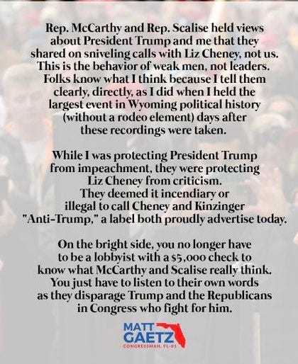 At the same time, Matt Gaetz is lashing out at McCarthy and his #2, Steve Scalise: