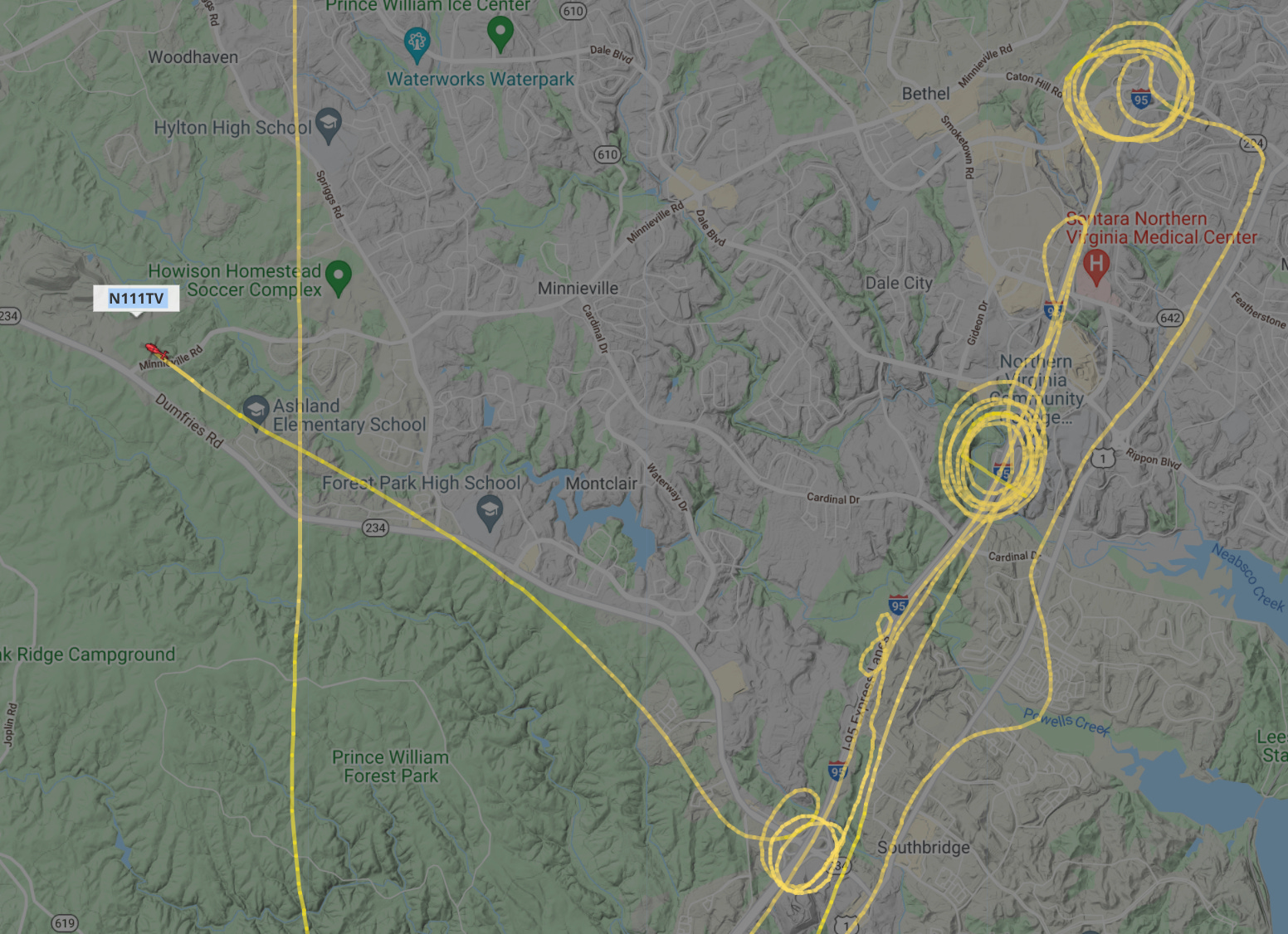 Those are the stories that need to be written. But as I was paying attention to this early this morning, I noticed helicopters flying over my house at a rate that is unusual unless there’s a lot of activity at MCB Quantico. And when you hear a lot of helicopters, you get to know the pitch of their rotors. And so when I went out because there was one I didn’t recognize, I looked it up on FlightRadar24. It was a Robinson R-66, based out of an airport next to Fort Meade, and Robinsons are popular with hobbyists, and not typically used by the government. And we had State Police helicopters, TV helicopters, MedEvacs, and local police helicopters. So I kept the tab open all day and was just fascinated by this flight path.