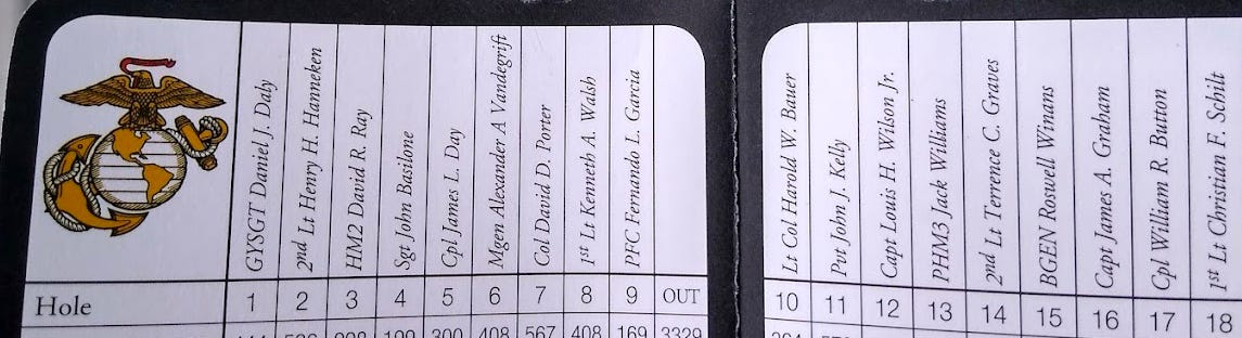 The course is called Medal of Honor, and each hole is named after a recipient of it. The first hole is named after Daniel Daly, who received two medals of honor. For you golfers among us, I was 11 over par (with one par) and lost two balls. My previous handicap was 15. I have some work to do. But I look forward to going back.