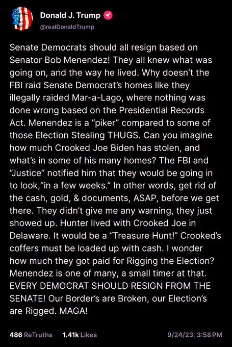 This is the same former president who has called for terminating provisions of the Constitution; orchestrated a coup to overturn the last presidential election; and absconded with military secrets. Lest you have forgotten, he has also been found liable for rape; and faces more than 90 felony counts for (among other things) paying off a porn star, conspiracy, obstruction, and defrauding the federal government.