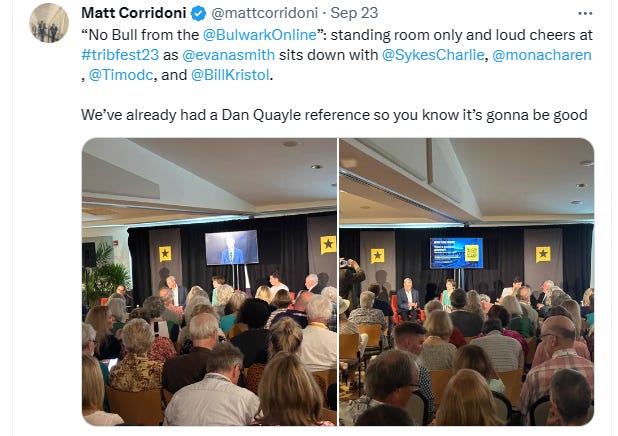 Quick Note: It was great meeting so many Bulwark readers/listeners at this weekend’s Texas Tribune Festival! We had a standing room only crowd for our “No Bull**** From the Bulwark” panel (with Bill, Tim, Mona, and me… moderated by Evan Smith.) I also moderated a discussion on ‘Trump Ever After” with Olivia Nuzzi. from New York Magazine; Bret Stephens from the NYT; and Berris Terris from the Washington Post. Didn’t make it to Austin? You can listen to the whole thing on today’s Bulwark podcast.