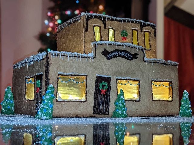 It’s perfect… My alma mater is having a gingerbread contest, and somebody did one of my college bar and place of employ, since closed.