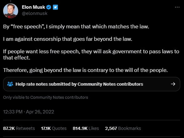 This seems like a good time to remind you that Musk’s understanding of free speech is about what you’d expect of an undereducated 12-year-old. Here he is from last year, demonstrating that he does not understand how authoritarian regimes operate… at all: