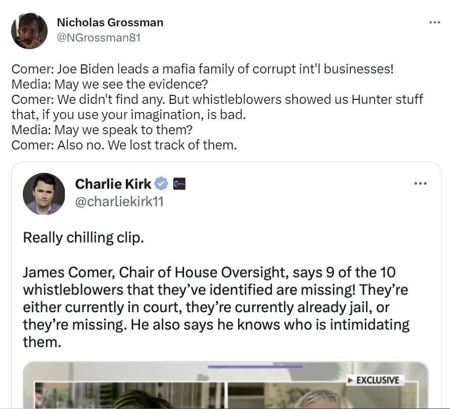 And the hunt for the Great White Whale isn’t going well. . . . House Oversight chairman James Comer has been promising YUGE bombshells and smoking guns about the “Biden Crime Family,” but had to admit yesterday that he has somehow mislaid his key informant.