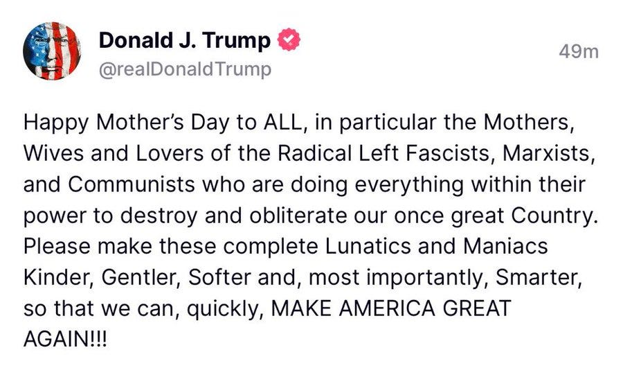 A reminder of what the GOP is in for. The former president’s touching Mother’s Day message to the nation. (NOT A PARODY.)