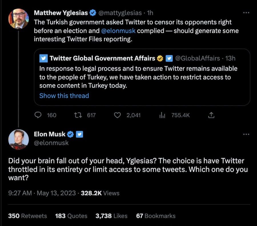 As Turkey’s democracy hung in the balance, Musk caved in to demands from the Erdogan government to censor Twitter ahead of the presidential election. And defended his toadying.