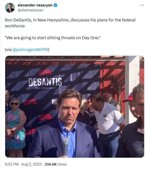 Slitting throats? Of people just going about the business of doing their jobs? DeSantis is not only a dick he's also seriously, seriously, seriously disturbed.