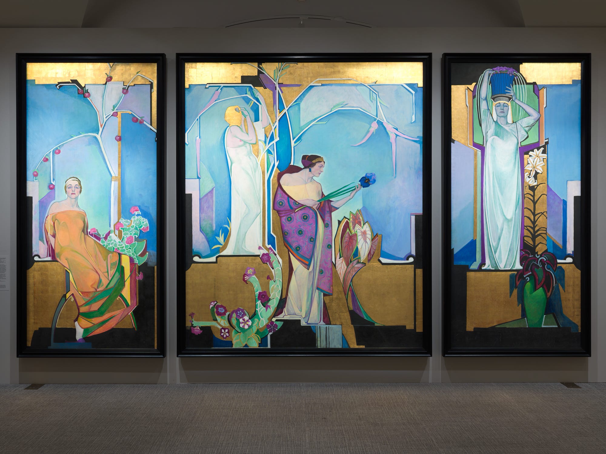 The entrance to the exhibition features three of the seven enormous panels of Edward Steichen’s In Exaltation of Flowers (1910–13); the three vast, vividly colored murals portray Katharine Rhoades, Agnes Meyer, and Marion H. Beckett—Steichen’s “Three Graces.” The murals function as a theatrical curtain, beckoning visitors to enter the exhibition beyond.