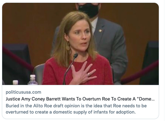 First of all, what “brief”? Dr. Brown, who bills himself as an “emotional intelligence expert,” seems to be confusing the draft opinion with a “brief.” (Or does he think a footnote is a “brief”?) Either way, the legal expertise here is unimpressive. Secondly, Justice Barrett has been dragged into this, apparently, for no other reason than that she’s an advocate for adoption and an adoptive mother, which is kind of creepy if you ask me.