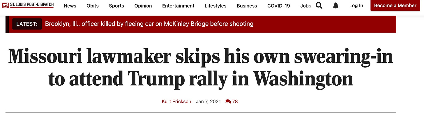 Rep. Justin Hill, R-Lake Saint Louis, said he didn’t enter the Capitol, but did watch the mob from a vantage point at the rear of the building.