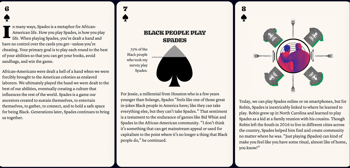 I love this piece on the African-American community and the card game Spades. Because it’s from the Pudding, it’s told in a beautiful, interactive format: