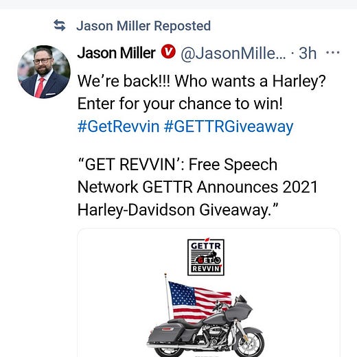 Win a free alt-right Harley*! Unless you fail to pass a background check that determines you’re “dirty” in the mind of former Trump spox Jason Miller….