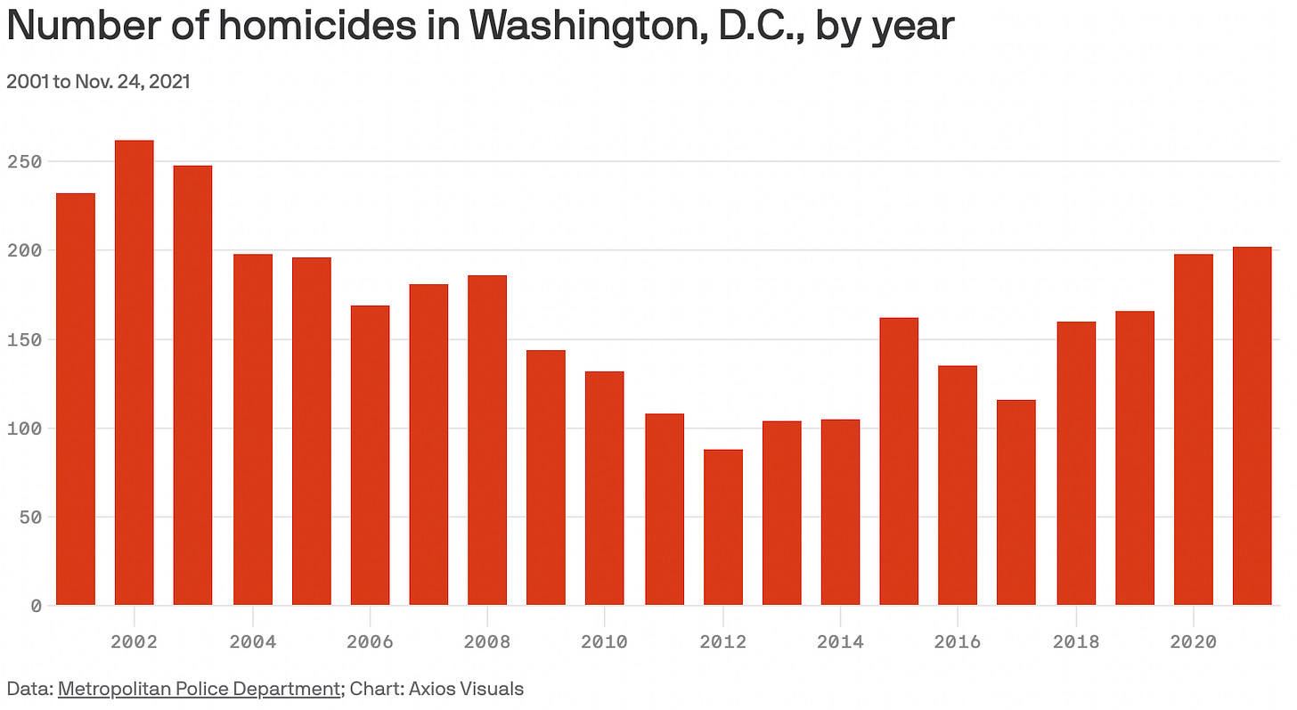 You see this at the national level, but also at the local level. Here’s a story from Axios this morning about the record number of murders in D.C. in 2021. Which is both true and very bad. But also, 2021 is not really an outlier for D.C. homicides. It’s part of a trend that began in . . . 2018.