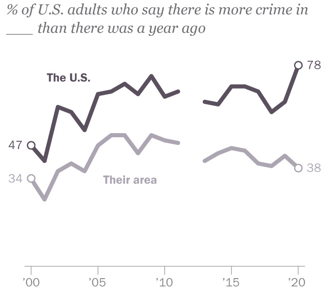 Yet none of this stops voters from coming to their own conclusions. Gallup asks voters if they think crime is up nationally and then if they think crime is up where they, personally, live: