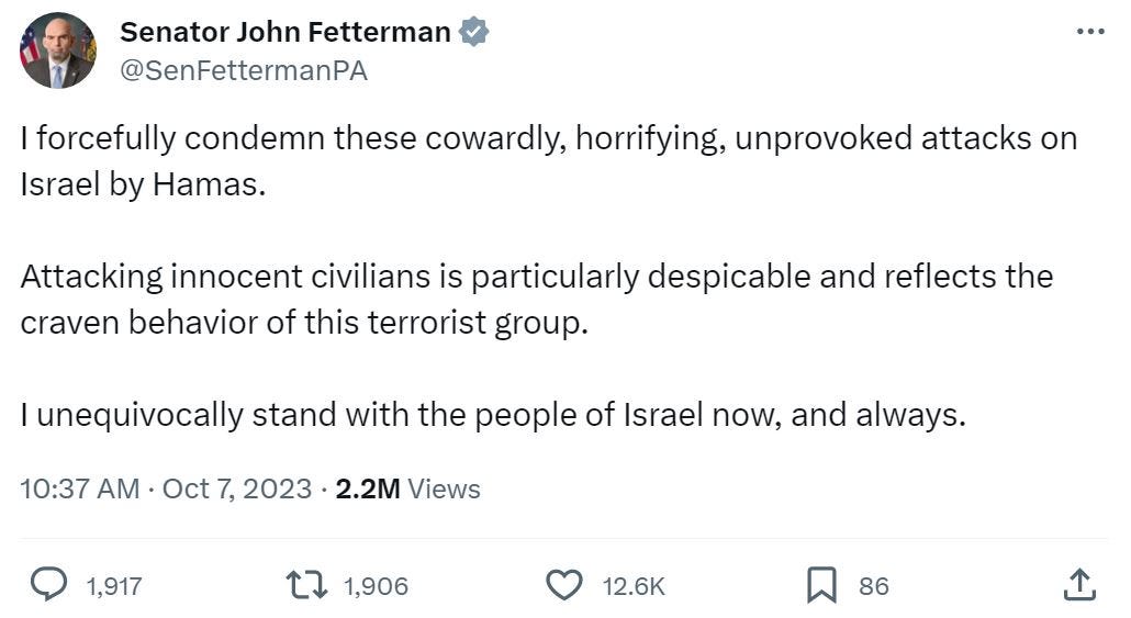 For contrast, Tom Cotton. “Nine Americans are dead, an unknown number are missing or held hostage, yet President Biden is nowhere to be seen and has nothing to say,” he tweeted on Monday, almost exactly two days after Biden’s televised remarks, one day after the news broke that Biden ordered the biggest warship ever built to park itself in the eastern Mediterranean, and just hours before the White House announced an extraordinary statement Biden released jointly with the leaders of France, Germany, Italy, and the United Kingdom. (The number of Americans killed in the attack has since been revised to eleven, and the final number may yet be higher.) The official statement posted to Cotton’s website on October 7 doesn’t mention Biden personally, but does say that the United States should “provide Israel the military and diplomatic support it needs to destroy Hamas.” That’s a much more specific, constructive contribution—and it happens to match almost verbatim what Biden the same day promised to do.
